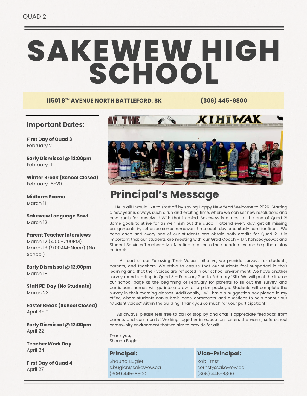 Welcome to the 2025-26 school year! My name is Shauna Bugler, principal of Sakewew High School. I am a member of Red Pheasant Cree Nation, and a long time resident of the Battlefords.